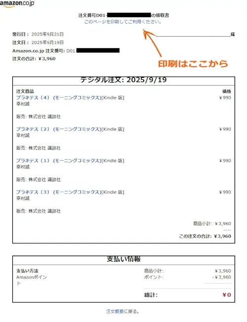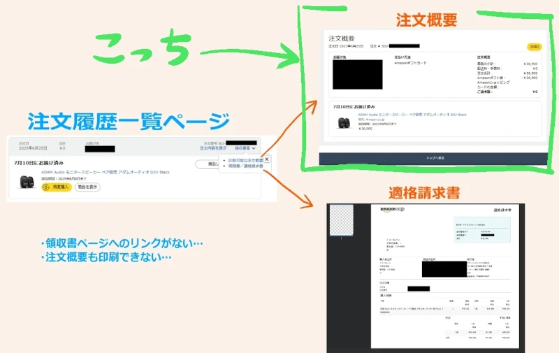 このタイプの商品の注文履歴には「印刷可能な注文概要」「明細書/適格請求書」しかリンクがなく、飛びたい領収書のページへのリンクが消えたっぽいのが現状。この症状に、支払い方法がクレジットカードだとか電子マネー類だとかは関係してないと思います。