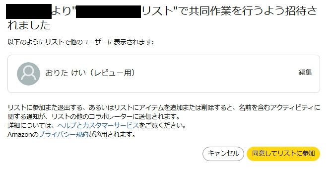 招待されても同意しなければ相手に私の公開プロフィール名を知られることはないですが、参加ボタンを押すとリストの共同編集者として私の名前(公開プロフィール名)がリストに追加されます。他に共同編集者がたくさんいれば、全員に公開プロフィール名が共有されることになるのです。
