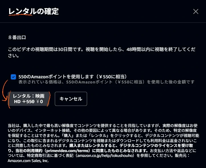 同じく「○○のAmazonポイントを使用します」にチェックを入れて、レンタルを確定させます。