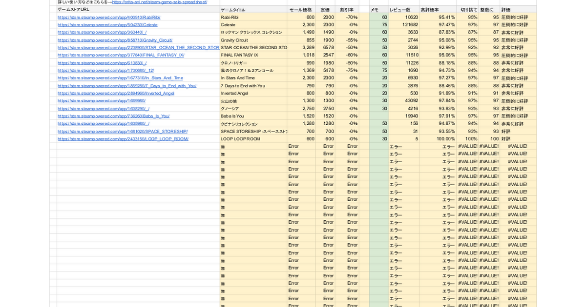 そんなわけで私は腰を上げ、購入済み・未購入関係なく、リストアップしたゲームタイトルの現時点の価格がわかるスプレッドシートを作ることにしました。といっても、STEAMおすすめセール画像でお馴染みのミミガーさんのスプレッドシートをコピーしてちょっと改変しただけなんですけど。