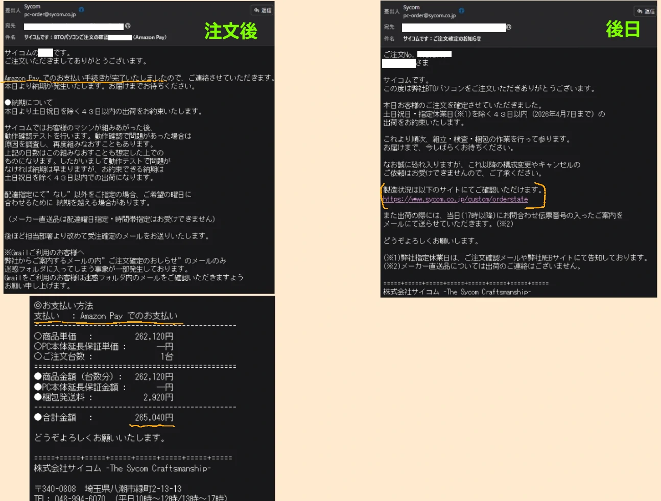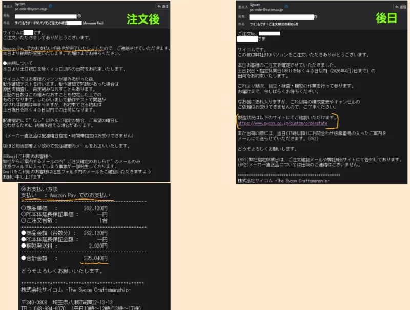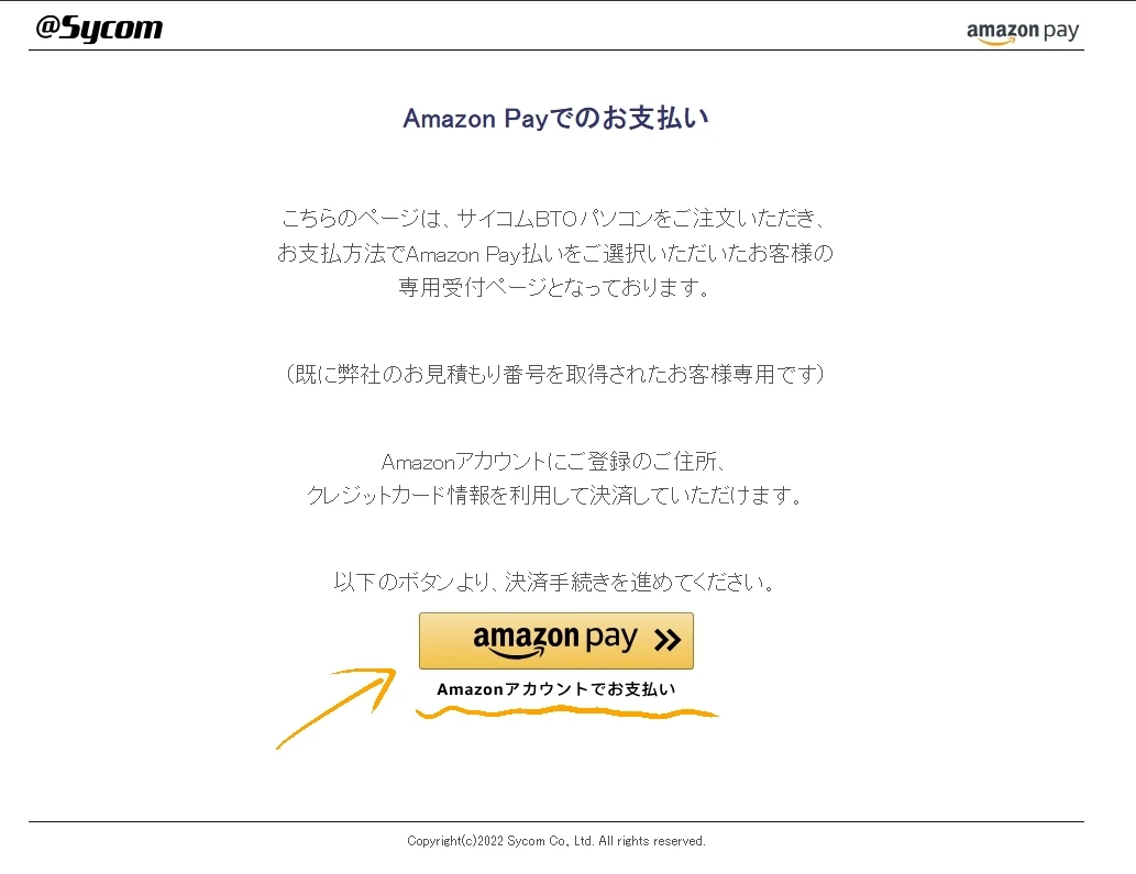 注文依頼を出すとサイコムからAmazon Pay支払い専用のリンクが記載されたメールが届きます。この時点ではまだまだ注文は確定してません。