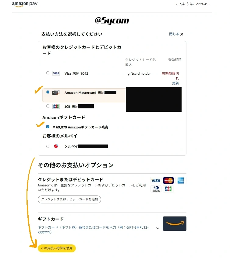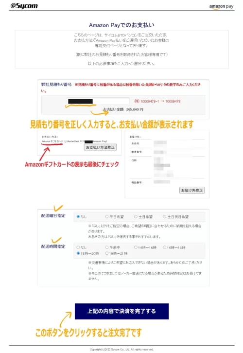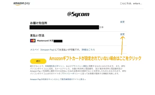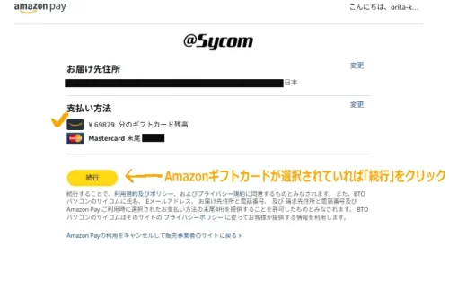 今回サイコムではAmazon payを利用したんですが、Amazonギフトカード残高からちゃんと支払いができました。