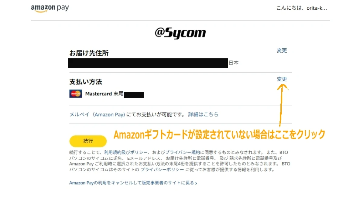 Amazon payにログインすると、上の画像のような支払い方法の設定画面が出てきます。支払い方法の箇所にすでにAmazonギフトカードが設定されていたらそのまま「続行」のボタンをクリックしてサイコムの支払いページに戻ってください。