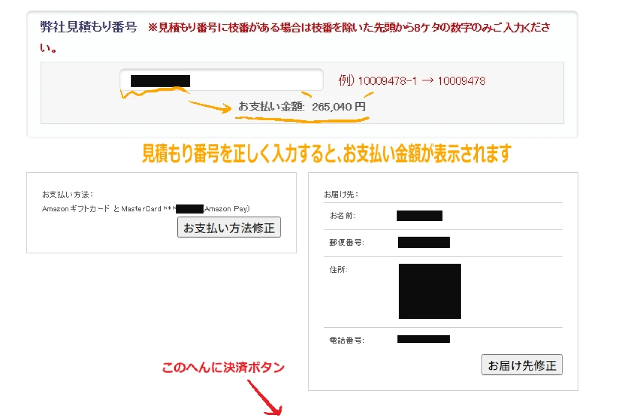 メールに記載されている見積もり番号(※注文番号とは別)を入力し、いよいよ決済完了の準備が整いました。