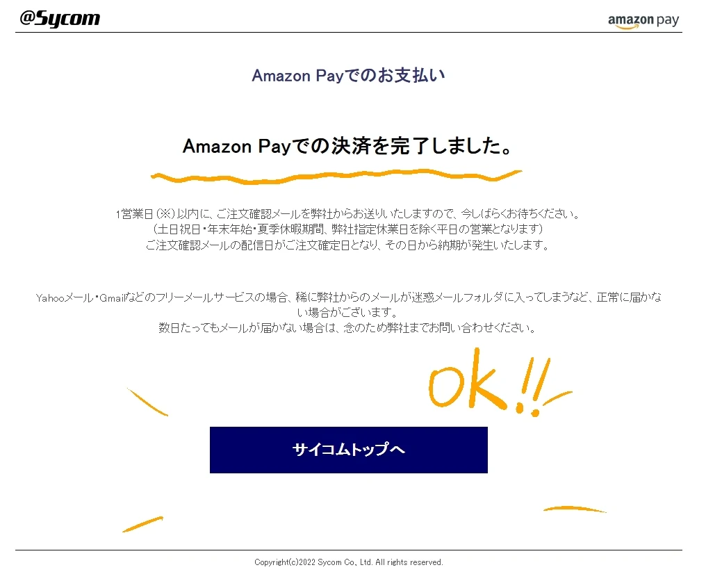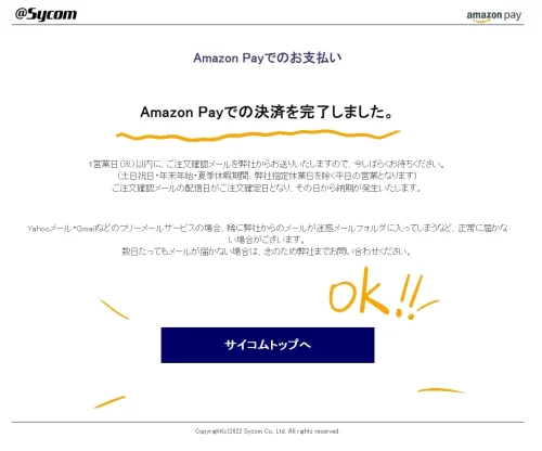 無事、Amazon Payでの決済が完了しました。最後の最後にエラーとか出なくてよかったです。