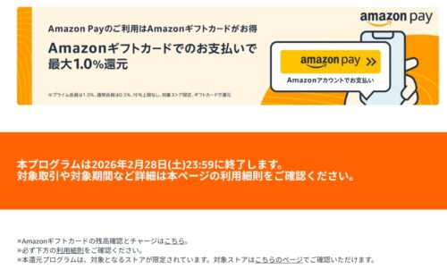 Amazon payの「最大1.0%Amazonギフトカード還元プログラム」は2026年2月28日に終了しました
