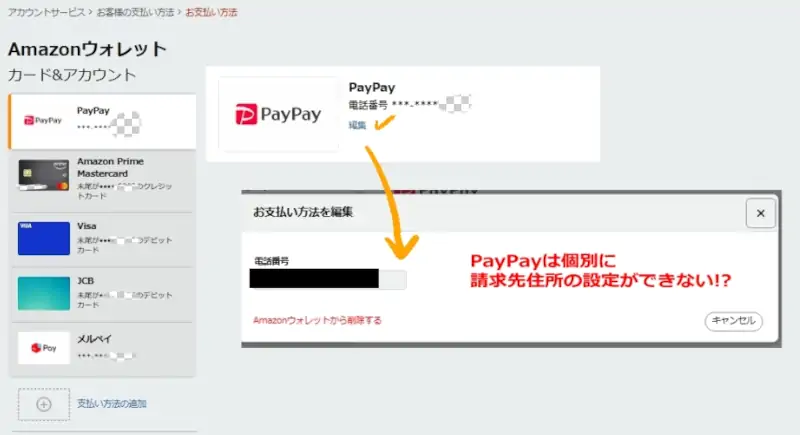 たぶん作成したての状態だと空白になっていると思いますが、ここがPayPayになっていなければ「お支払い方法:変更」のリンクからPayPayを優先するお支払い方法として選択します。