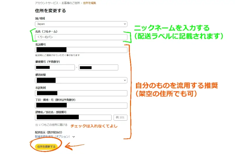 手順を詳しく書いてると本題に入るのが長くなっちゃうので、あまりよく知らない方は過去記事を読んでください。ニックネーム版の請求先住所の作り方と要点が書かれています。