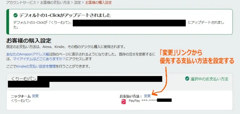 「デフォルトの「1-Click設定」(支払い方法)がアップデートされました」というガイドが表示されて、ニックネーム版住所が選択中の支払い方法に変わります。