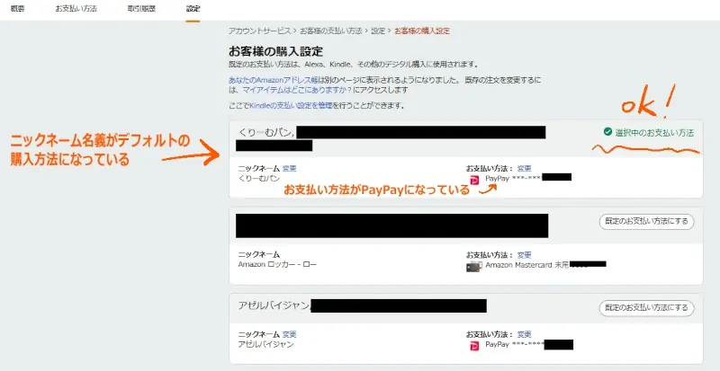 続いて「デフォルトの購入オプション」をニックネームに変更します。さらにPayPayをデフォルトの支払い方法に変更します。