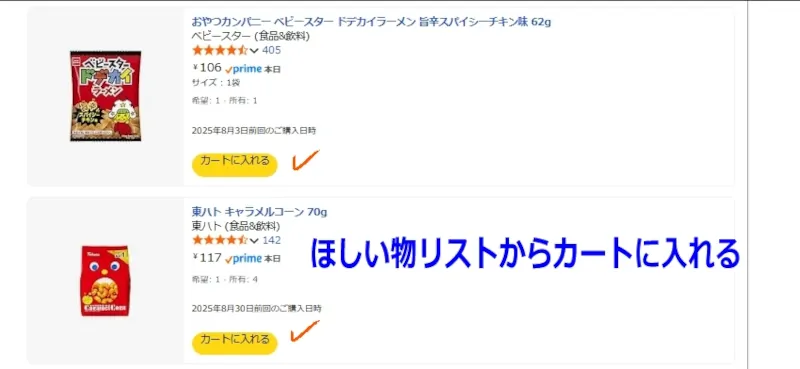 送りたい商品をほしい物リスト上から「カートに入れる」ボタンでカートに追加していきます。