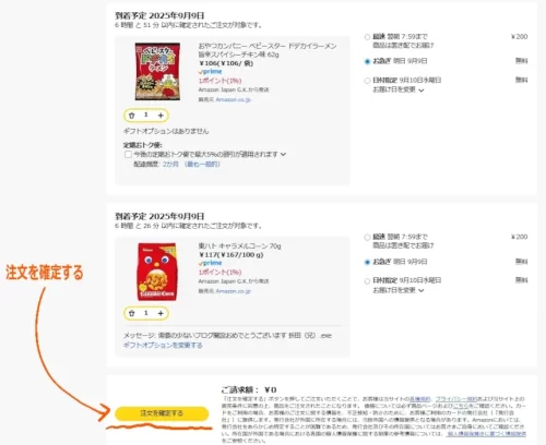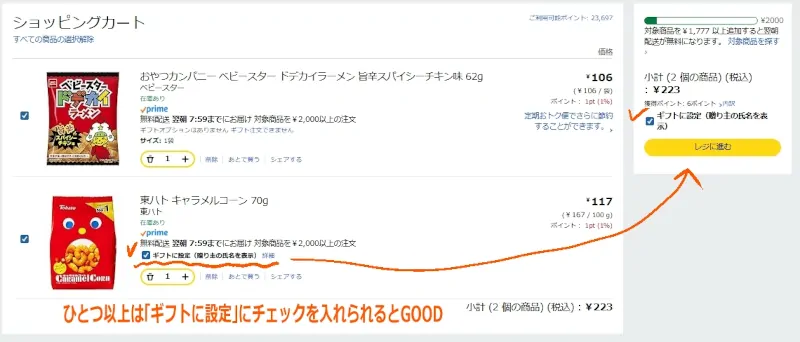 今回は抱き合わせの例として、東ハトのキャラメルコーン(ギフトオプションあり)とベビースターラーメン(ギフトオプションなし)を一緒に購入することにしました。