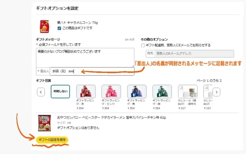 注意点としては、ギフトオプションがない商品だけ購入するとレジ画面でギフトオプションの設定ができなくなります。メッセージが書けなかったり贈り主の名前(ニックネーム)が提示できないことになりますので、「ギフトに設定」がある商品を選びましょう。