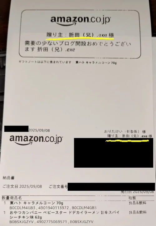 「このお届け物はギフト(贈物)です。贈り主:くりーむパン、くりーむパン」となっているのがあなたにも見えるでしょう。ニックネームがふたつあるのは商品がふたつあるからで、商品が単品であれば表記されるニックネームもひとつになります。